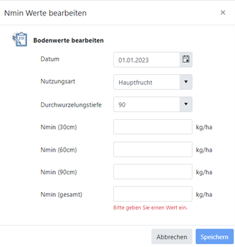 Um die Nmin-Werte einzutragen auf den blauhinterlegten Button „Nmin Werte eintragen“ anklicken.