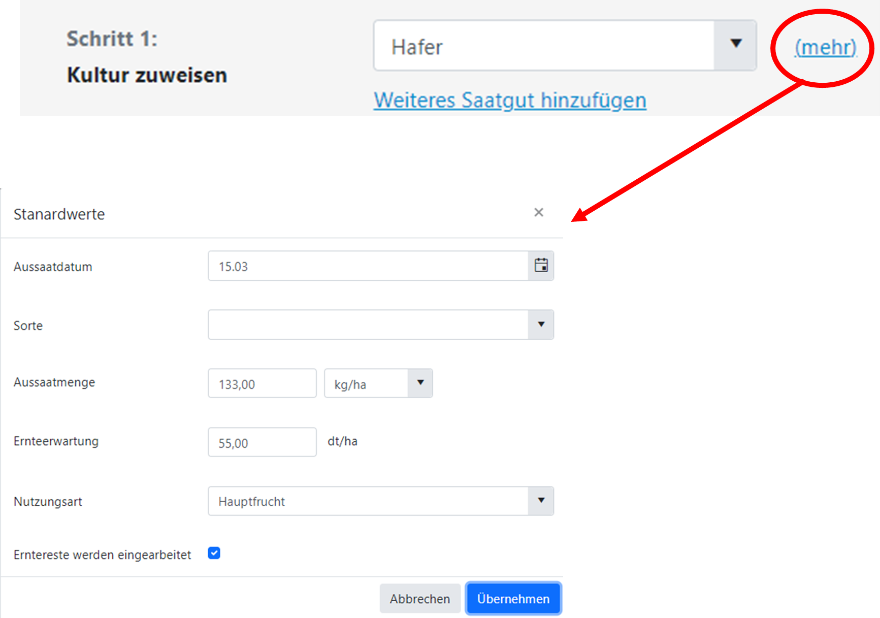 Unter diesem Vorgehen wird für die geplanten Kulturen Standardwerte für Aussaatdatum, Ernteerwartung und Erntereste hinterlegt.