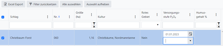 Soll ein Eintrag hingegen gelöscht werden, wird der entsprechende Anbaueintrag in der Auflistung ausgewählt, aber keine Kultur zugewiesen (Das Feld leer lassen).