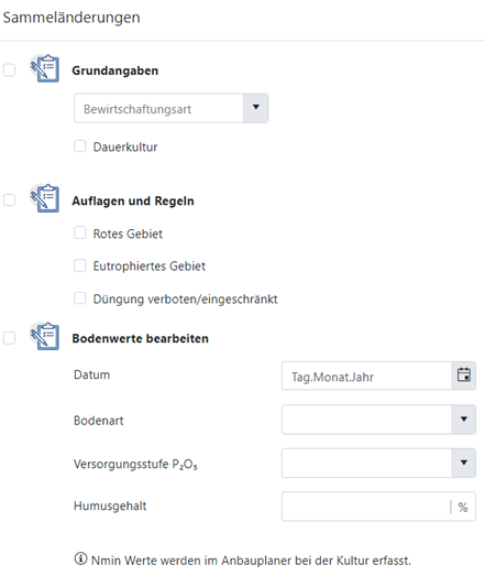 Die Anpassung dieser Angaben kann entweder schlagindividuell oder als Sammeländerung erfolgen.