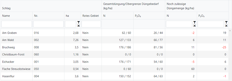 Unter der Schlagübersicht werden alle Schläge und deren gesamt zulässige Düngung, sowie die bereits ausgebrachte Nährstoffmengen. Zusätzlich wird die Differenz dieser Mengen ausgewiesen. Dies dient der besseren Übersicht und ermöglicht eine differenzierte Planung weiterer Düngeaktivität. Rot geschriebene Zahlen weisen auf eine Überdüngung hin.